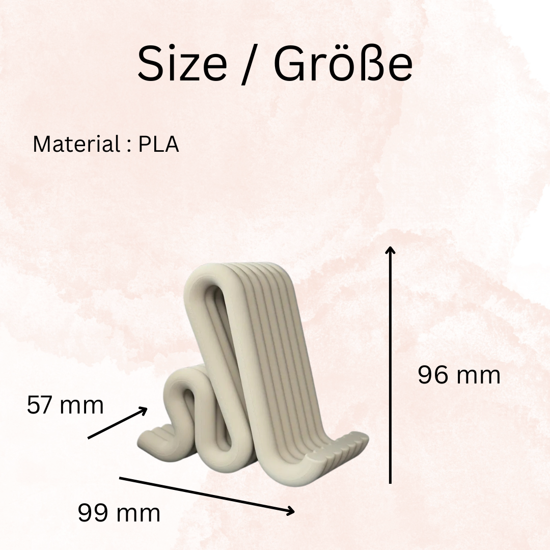 Dieser moderne Telefonständer überzeugt durch sein weiches Flow-Design, das Funktionalität und Minimalismus perfekt vereint. Die sanften Kurven sorgen für eine elegante Form, während Ihr Smartphone stabil und gut sichtbar positioniert wird – ideal für den Schreibtisch, die Küche oder den Nachttisch.